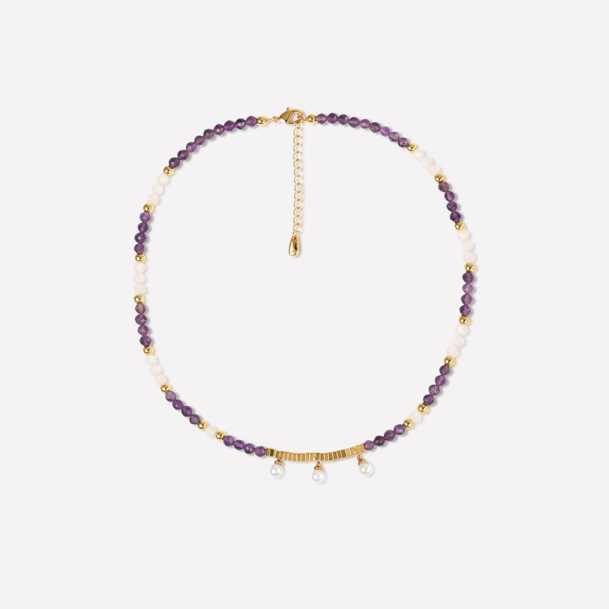 Set with amethyst, rose quartz, and shell pearls.