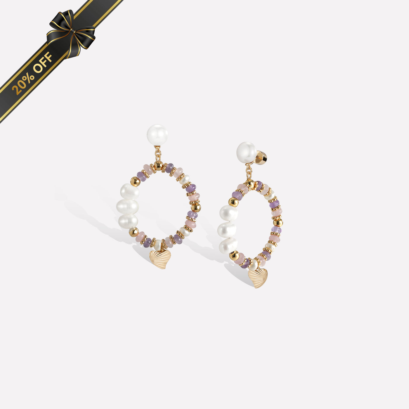 Gold-plated brass set with natural amethyst, rose quartz, and freshwater pearls.