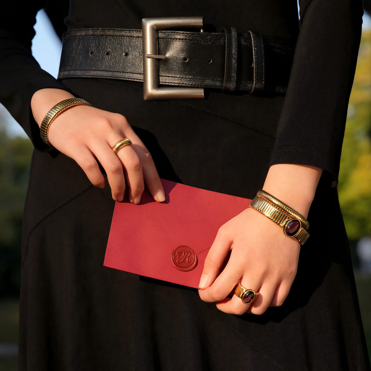 Inspired by Roman gladiators, this collection merges vintage charm with modern strength. Black enamel and burgundy glass stones evoke power, sensuality, and timeless beauty.